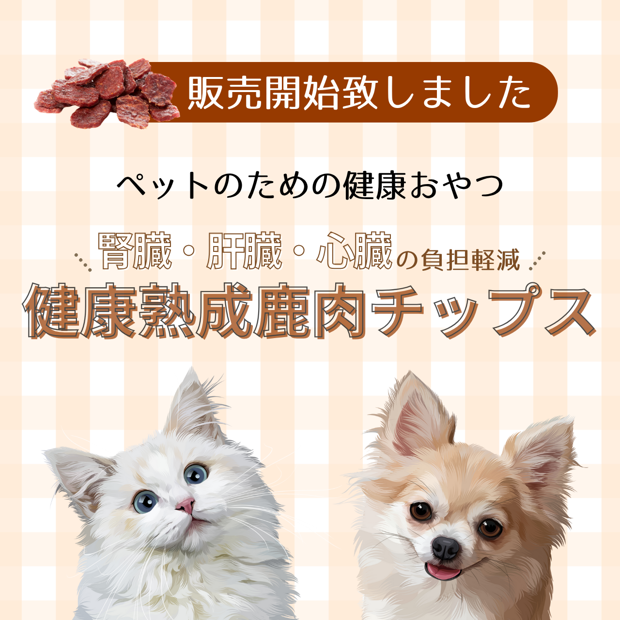 水分量の多いしっとり系熟成鹿肉チップス。ペットの健康長生きを目指します。